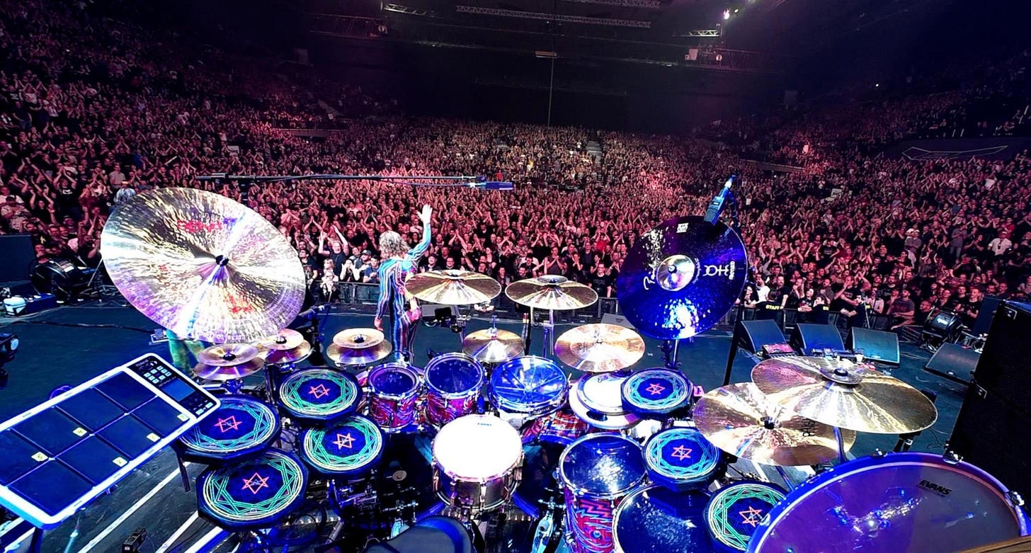 Lá pelas tantas, o painel de LED atrás dele começa a mostrar imagens da bateria através de uma câmera instalada em sua cabeça. A sensação da platéia é de estar tocando o solo junto com ele. Fantástico.